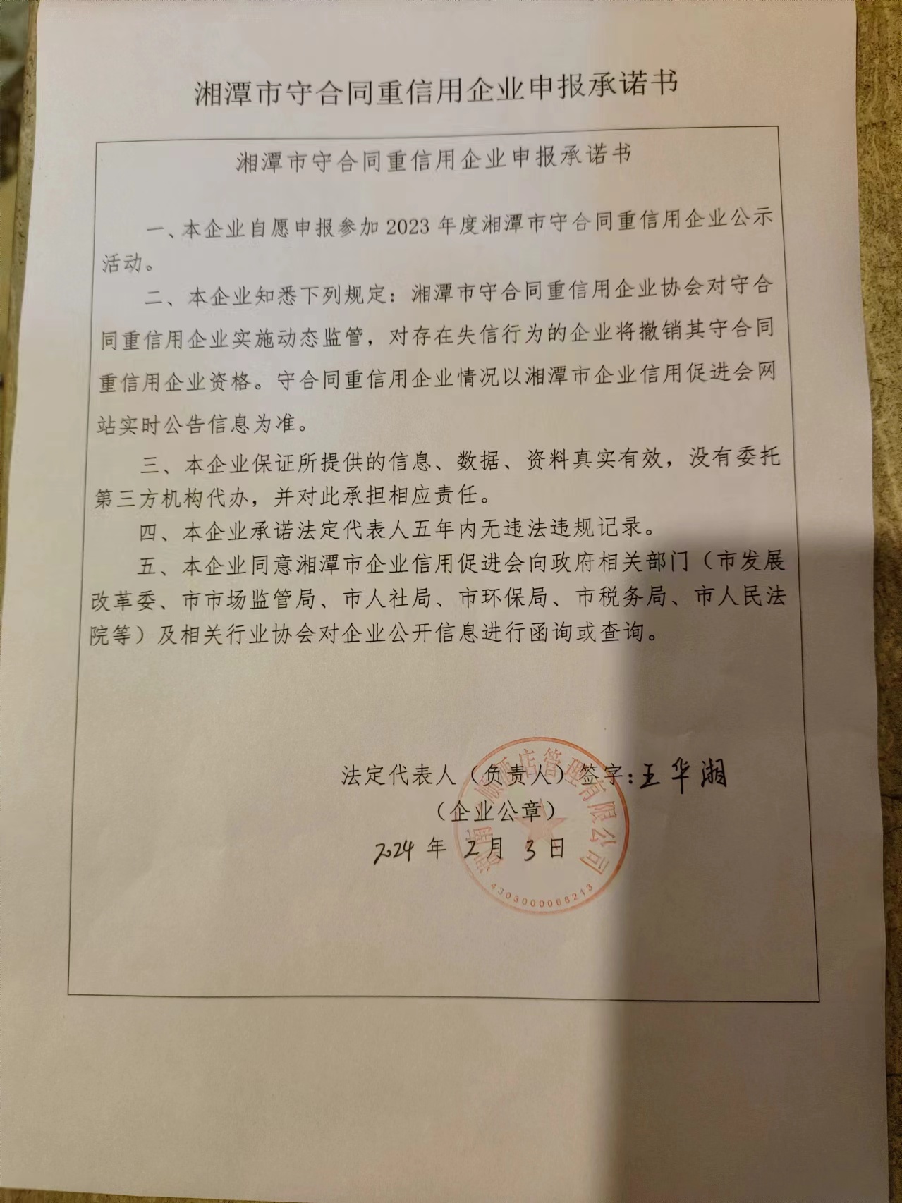 本企業(yè)根據(jù)《湘潭市守合同重信用企業(yè)申報規(guī)定》等編制 2023 年度企業(yè)信用報告書,并保證本報告書內(nèi)容真實、準確、完整。